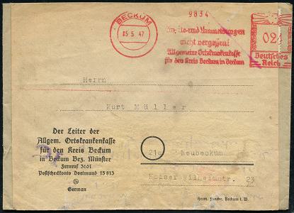 8298 | 35 € | PL-Raum 47.. (ohne Hamm) : BECKUM/ ..Allgemeine Ortskrankenkasse/ für den Kreis Beckum in Beckum 1947 (5.5.) aptierter AFS Francotyp "Hakenkreuz" = entfernt = Notmaßnahme! , Recyclings-Fern-Bf. (doppelt verwendet !, Bedarfsspuren) n. Neubeckum (Dü.E-12 H-98h = sehr seltene Type!) | ![]() | |