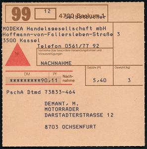 8301 | 10 € | PL-Raum 47.. (ohne Hamm) : 4720 Beckum 1 1971 (Juli) EDV-Freistenpel "Selbstbucher, MODEKA Handelsges. mbH.. 3500 Kassel", 5,40 (DDM) Inl.-Selbstbucher-NN-Paketkt. n. Ochsenfurt | ![]() | |