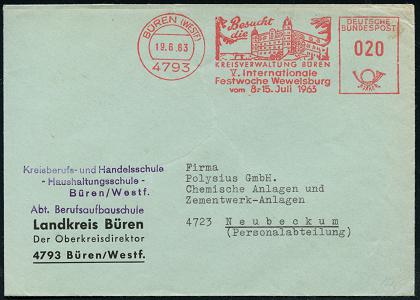 8305 | 18 € | PL-Raum 47.. (ohne Hamm) : 4793 BÜREN (WESTF)/ Besucht/ die/ ..V.Internat./ Festwoche Wewelsburg/ vom 8.-15.Juli 1963 (19.6.) seltener AFS Francotyp (Wewelsburg) auf Kommunal-Bf.: Berufsaufbauschule, Landkreis Büren.., in der NS-Zeit war die Wewesburg Kultstätte der SS bis 1945 (Dü.E-23CO, nur kurze Verwendungszeit) | ![]() | |