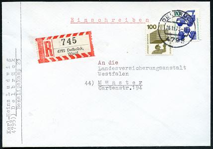 8306 | 12 € | PL-Raum 47.. (ohne Hamm) : 4795 DELBRÜCK/ c 1973 (26.11.) 1K-Segment auf 70 Pf. u. 100 Pf. Unfall, satzreine Frankatur + RZ: 4795 Delbrück,/ Westf (zweizeilig) Fern-R-Bf. | ![]() | |