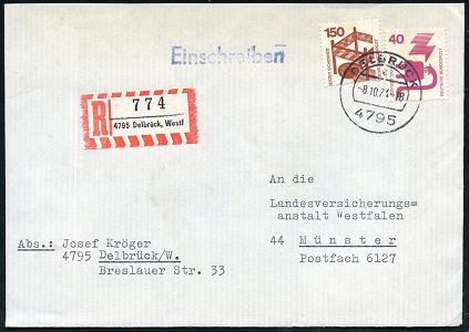 8307 | 10 € | PL-Raum 47.. (ohne Hamm) : 4795 DELBRÜCK/ c 1974 (8.10.) 1K-Segment auf 40 Pf. u. 150 Pf. Unfall + RZ: 4795 Delbrück, West (einzeilig) klar gest. Fern-R-Bf. | ![]() | |