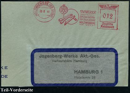 8314 | 15 € | PL-Raum 47.. (ohne Hamm) : HOLZWICKEDE (KR UNNA)/ V.W.WERKE/ VINCENZ WIEDERHOLT/ SPEZIALFABRIK/ FÜR STAHLROHRE.. 1941 (28.8.) AFS Francotyp "Reichsadler" (2 Stahlrohre) klar gest. Teil-Vorderseite (Dü.E-5CEo) | ![]() | |
