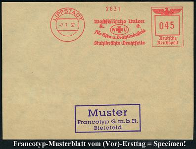 8318 | 35 € | PL-Raum 47.. (ohne Hamm) : LIPPSTADT/ Westfälische union/ K.K./ für Eisen u.Drahtindustrie.. 1937 (7.7.) AFS-Musterabdruck Francotyp "Reichsadler" (Monogr.-Logo mit "Eisernem Kreuz") glasklar gest. Francotyp-Musterblatt vom (Vor)-Ersttag !, selten! (Dü.E-5CGh) | ![]() ![]() | |