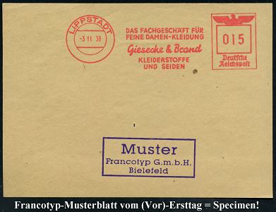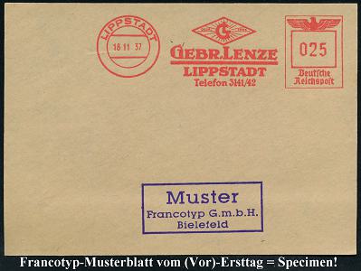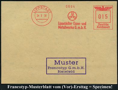 8321 | 35 € | PL-Raum 47.. (ohne Hamm) : LIPPSTADT/ Lippstädter Eisen-u./ Metallwerke GmbH 1939 (24.3.) AFS-Musterabdruck Francotyp "Reichsadler" (Firmen-Logo) glasklar gest. Francotyp-Musterblatt vom (Vor)-Ersttag !, selten! (Dü.E-5CGh) | ![]() ![]() | |