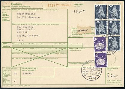 8334 | 16 € | PL-Raum 47.. (ohne Hamm) : 4773 MÖHNESEE/ Komm/ zum/ Möhnesee.. 1976 (29.10.) HWSt 3x auf Frankatur Technik Paar 30 Pf. u. 5er-Block 500 Pf. Radioteleskop = 2560 Pf.! , satzreine Frankatur + brauner Paketzettel: 4773 Möhnesee 1, sauber gest. Übersee-Paket-Kt. (kl. Klammerpunkte) n. U.S.A. | ![]() | |