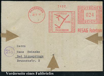 8345 | 18 € | PL-Raum 47.. (ohne Hamm) : PADERBORN/ Straßenbahnen im/ Teutoburger Wald/ PESAG.. 1947 (28.6.) AFS Francotyp "Mäanderrechteck" unverändert weiterverwendet mit Inschrift "DEUTSCHES REICH" = Notmaßnahme! (Straßenbahnstrecken) klar gest. Vorderseite eines Faltbriefes (Dü.E-2CGh, unveränert !) | ![]() | |