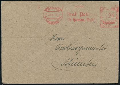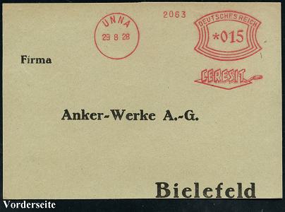 8383 | 15 € | PL-Raum 47.. (ohne Hamm) : UNNA/ CERESIT 1928 (29.8.) AFS Francotyp "Bogenrechteck" (Maurerkelle) Bedarfs-Vorderseite (Dü.E-1Ah) | ![]() | |