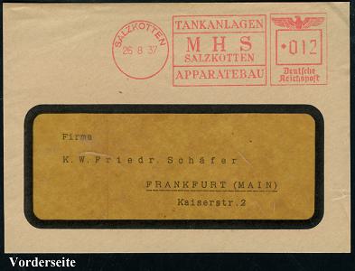 8362 | 15 € | PL-Raum 47.. (ohne Hamm) : SALZKOTTEN/ TANKANLAGEN/ MHS../ APPARATEBAU 1937 (26.8.) AFS Francotyp "Reichsadler" auf Bedarfs-Vorderseite (Dü.E-5DGo) | ![]() | |