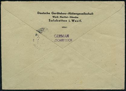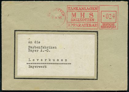 8363 | 25 € | PL-Raum 47.. (ohne Hamm) : SALZKOTTEN/ TANKANLAGEN/ MHS../ APPARATEBAU 1946 (7.4.) aptierter AFS Francotyp Antiqua "Reichsadler" (im Ort teils etw. undeutl.) rs. Abs.-Vordruck: Deutsche Gerätebau AG, Werk Martini-Hüneke.., seltener Fern-Bf. (Dü.E-14 C-231o = seltene Type) | ![]() ![]() | |