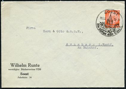 8371 | 15 € | PL-Raum 47.. (ohne Hamm) : SOEST/ die schöne alte Stadt 1933 (30.5.) HWSt (Ortsbild mit Torturm) Firmen-Bf.: Wilhelm Runte, vereidigter Bücherrevisor VDB.. (Bo.3 = Letztjahr) | ![]() | |