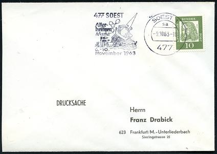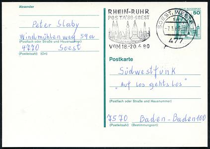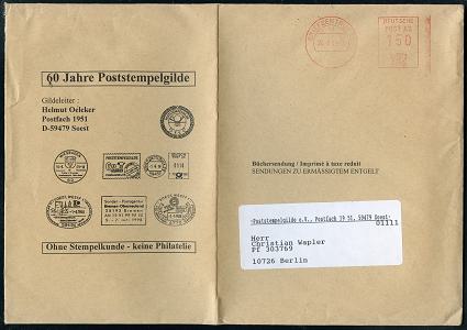 8381 | 8 € | PL-Raum 47.. (ohne Hamm) : Soest 1993 (24.8.) PFS Posthorn: BRIEFZENTRUM 59/DEUTSCHE POST AG , 150 Pf. , gefalteter Vordruck-Bf.: 60 Jahre Poststempelgilde.., seltene Portostufe! | ![]() | |