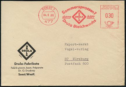 8375 | 16 € | PL-Raum 47.. (ohne Hamm) : 477 SOEST 1/ Sommersprossen?/ dann hilft/ Drula Bleichwachs 1969 (4.9.) AFS Francotyp (Firmen-Logo) motivgl. Firmen-Bf. (Dü.E-23CO) | ![]() | |