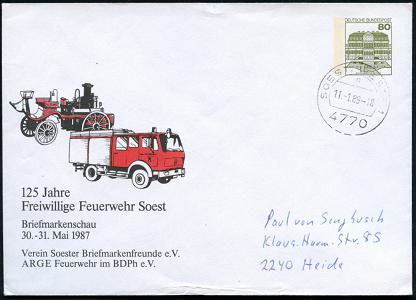 8379 | 5 € | PL-Raum 47.. (ohne Hamm) : 4770 SOEST,WESTF 1/ g 1989 (11.1.) 1K-Segment aus PU 80 Pf. Burgen, oliv: 125 Jahre Freiwillige Feuerwehr Soest.. (Histor. u. mod. Lösch-Kfz) rs. Klappenriß, Bedarf | ![]() | |