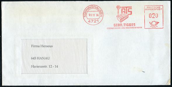 8382 | 14 € | PL-Raum 47.. (ohne Hamm) : 4721 SÜNNINGHAUSEN/ GTS/ 100 JAHRE/ GEBR.TIGGES/ EISENGIESSEREI U.MASCHINENFABRIK 1964 (6.11.) Jubil.-AFS Francotyp (Gußtiegel u. Form) Fern-Bf. (Dü.E-23CG) | ![]() | |