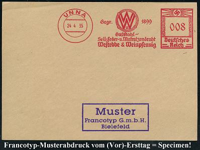 8384 | 35 € | PL-Raum 47.. (ohne Hamm) : UNNA/ Gegr.1899/ Gußstahl-/ Seil-,Feder-u.Matratzendraht/ Westebbe & Weispfennig 1935 (24.4.) AFS-Musterabdruck Francotyp "Hakenkreuz" (Monogr.-Logo) glasklar gest. Francotyp-Musterblatt vom (Vor)-Ersttag !, selten! (Dü.E-3CEo) | ![]() ![]() | |