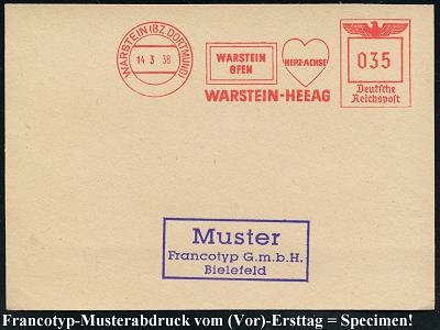 8389 | 35 € | PL-Raum 47.. (ohne Hamm) : WARSTEIN (BZ DORTMUND)/ WARSTEIN/ OFEN/ HERZ-ACHSE/ WARSTEIN-HEEAG 1938 (14.3.) AFS-Musterabdruck Francotyp "Reichsadler" (Herz-Logo) glasklar gest. Francotyp-Musterblatt vom (Vor)-Ersttag !, selten! (Dü.E-5CGo) | ![]() ![]() | |