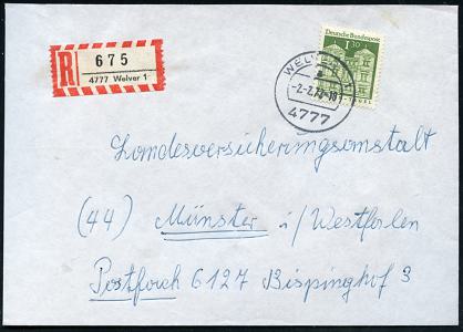 8392 | 12 € | PL-Raum 47.. (ohne Hamm) : 4777 WELVER 1/ a 1972 (2.2.) 1K-Segment auf EF 130 Pf. Tegel + RZ: 4777 Welver 1 , klar gest. Fern-R-Bf. (Mi.502 EF) | ![]() | |