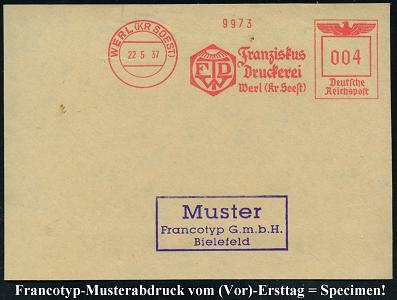 8393 | 35 € | PL-Raum 47.. (ohne Hamm) : WERL (KR SOEST)/ FDW/ Franziskus/ Druckerei.. 1937 (22.5.) AFS-Musterabdruck Francotyp "Reichsadler" (Monogr.-Logo mit Sonne) glasklar gest. Francotyp-Musterblatt vom (Vor)-Ersttag !, selten! (Dü.E-5CGh) | ![]() ![]() | |