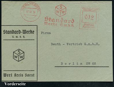 8394 | 14 € | PL-Raum 47.. (ohne Hamm) : WERL (KR SOEST)/ SWW/ Standard/ Werke GmbH 1939 (17.10.) AFS Francotyp "Reichsadler" (Monogr.-Logo) motivgl. Firmen-Vorderseite, vergl. Kat.Nr.8396 (Dü.E-5CEo) | ![]() | |