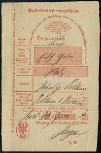 8368 | 14 € | PL-Raum 47.. (ohne Hamm) : Soest 1865 (22.6.) roter Post-Einlieferungschein (Adler, Posthorn) für Wertbrief n. Hamm (kl. Rißchen geschl.) Form "C. 62." | ![]() | |