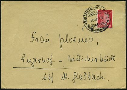 8294 | 18 € | PL-Raum 47.. (ohne Hamm) : BAD SASSENDORF (KR.SOEST)/ hilft durch/ Baden u.Jnhalieren 1942 (27.11.) HWSt auf Hitler-Frakatur , Bedarfs-Bf. (Bo.2, Bochmann 1942 unbekannt) | ![]() | |