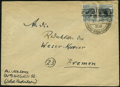 8288 | 16 € | PL-Raum 47.. (ohne Hamm) : (21a) BAD LIPPSPRINGE/ Heil-/ Bad/ Katarrhe-Asthma-Lungenleiden 1948 (16.7.) HWSt auf Paar 12 Pf. Arbeiter, Band-Aufdruck "Posthorn" (Mi.40 I, MeF + 10.- EUR) Fernbf. (Bo.5, nur 1948-50 verwendet!) | ![]() | |
