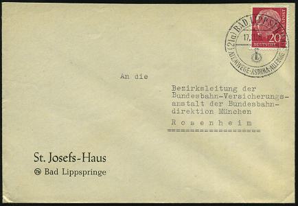 8289 | 12 € | PL-Raum 47.. (ohne Hamm) : (21a) BAD LIPPSPRINGE/ ATEMWEGE-ASTHMA-ALLERGIE 1956 (17.11.) HWSt klar auf Firmen-Bf.: St. Josefs-Haus.. (Bo.7) | ![]() | |
