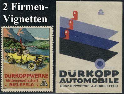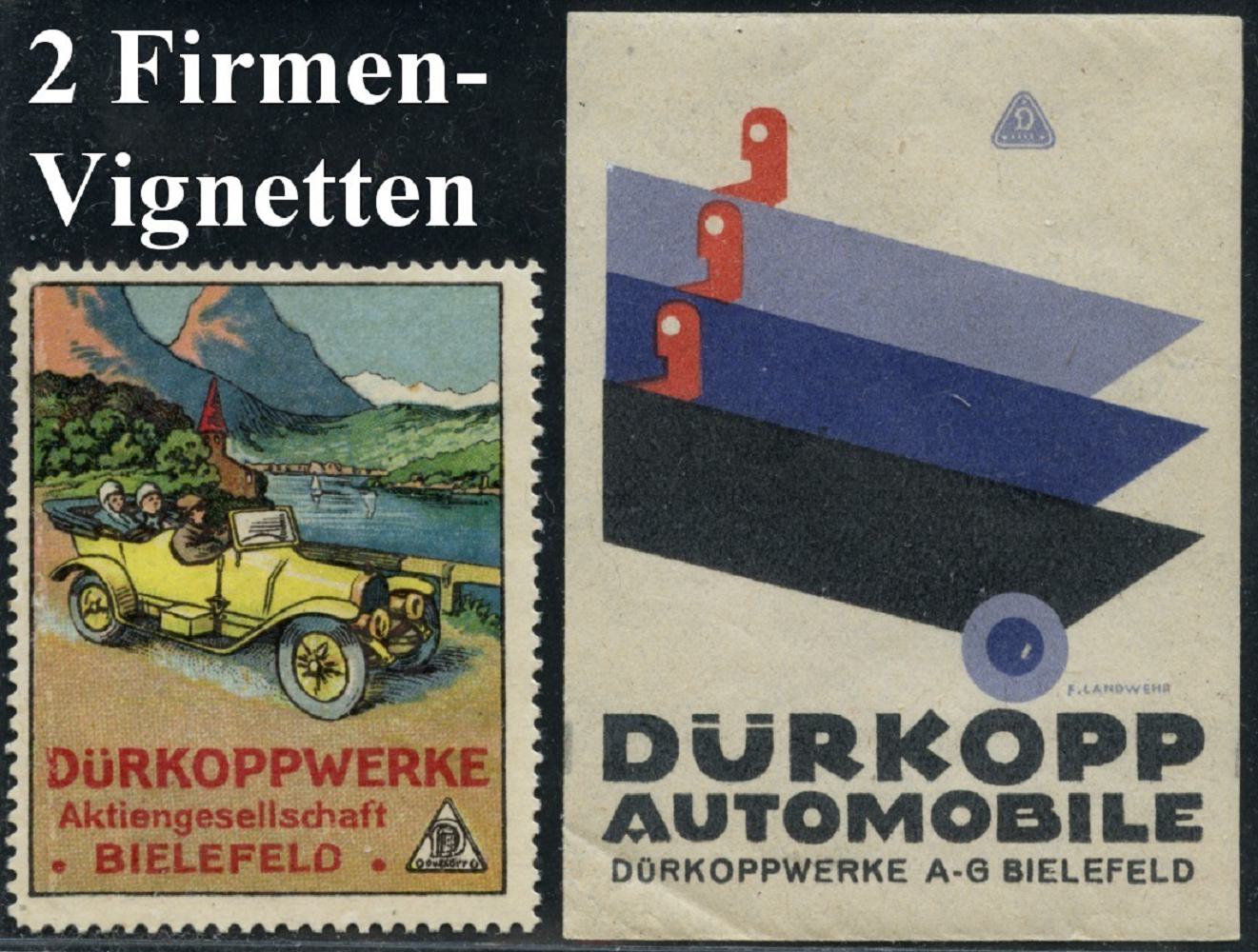 8399 | 25 € | 4800 Bielefeld allgem. Belege, Tagestempel etc. : Bielefeld 1910/25 2 verschiedene Color-Reklame-Vignetten: DÜRKOPPWAREKE (ca. 1910) bzw. DÜRKOPP AUTOMOBILE im Bauhaus-Design, sign. F. Landwehr , je Teil-Originalgummi (Einzelverkauf möglich: je 15.- EUR), 2 Belege | ![]() | |