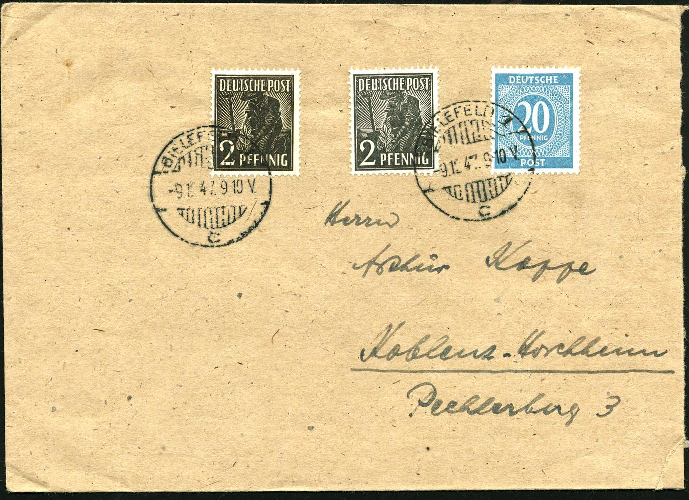 8408 | 18 € | 4800 Bielefeld allgem. Belege, Tagestempel etc. : BIELEFELD 1/ C 1947 (9.12.) ungewöhnl. Nachkriegs-1K-Gitterbrücke = Notmaßnahme! , 2x klar gest. Inl.-Bf. (Mi.924, 2x 943) | ![]() | |