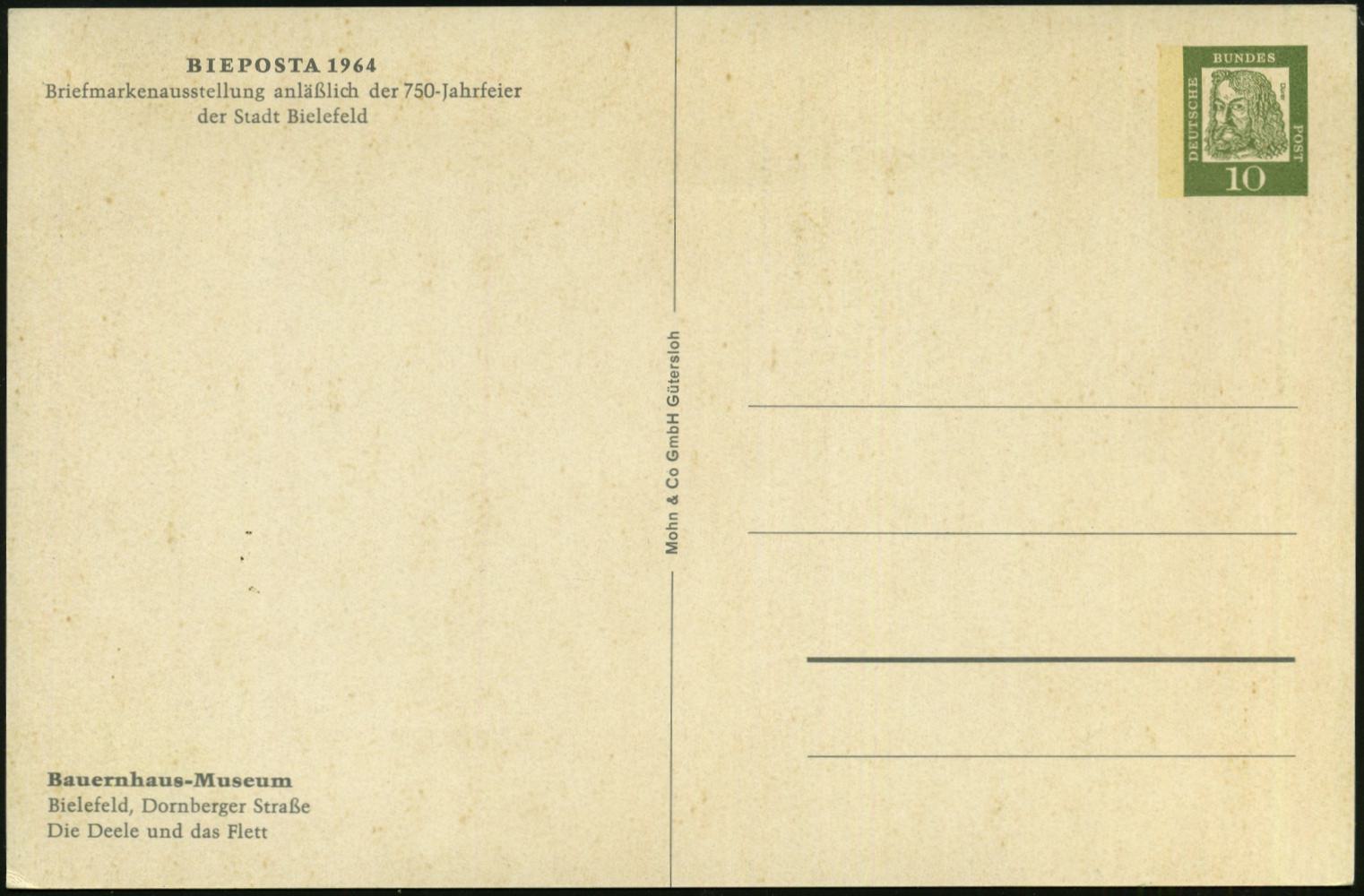8413 | 18 € | 4800 Bielefeld allgem. Belege, Tagestempel etc. : Bielefeld 1964 PP 10 Pf. Dürer, grün: BIEPOSTA.. 750 Jahrfeier, Bauernhaus-Museum, Deele u. Flett (zahlreiche histor. Geräte, Holzwagen etc.) ungebr., selten!, vergl. Kat.-Nr.8422 (Mi.PP 28/9 = Großformat A5) | ![]() ![]() | |