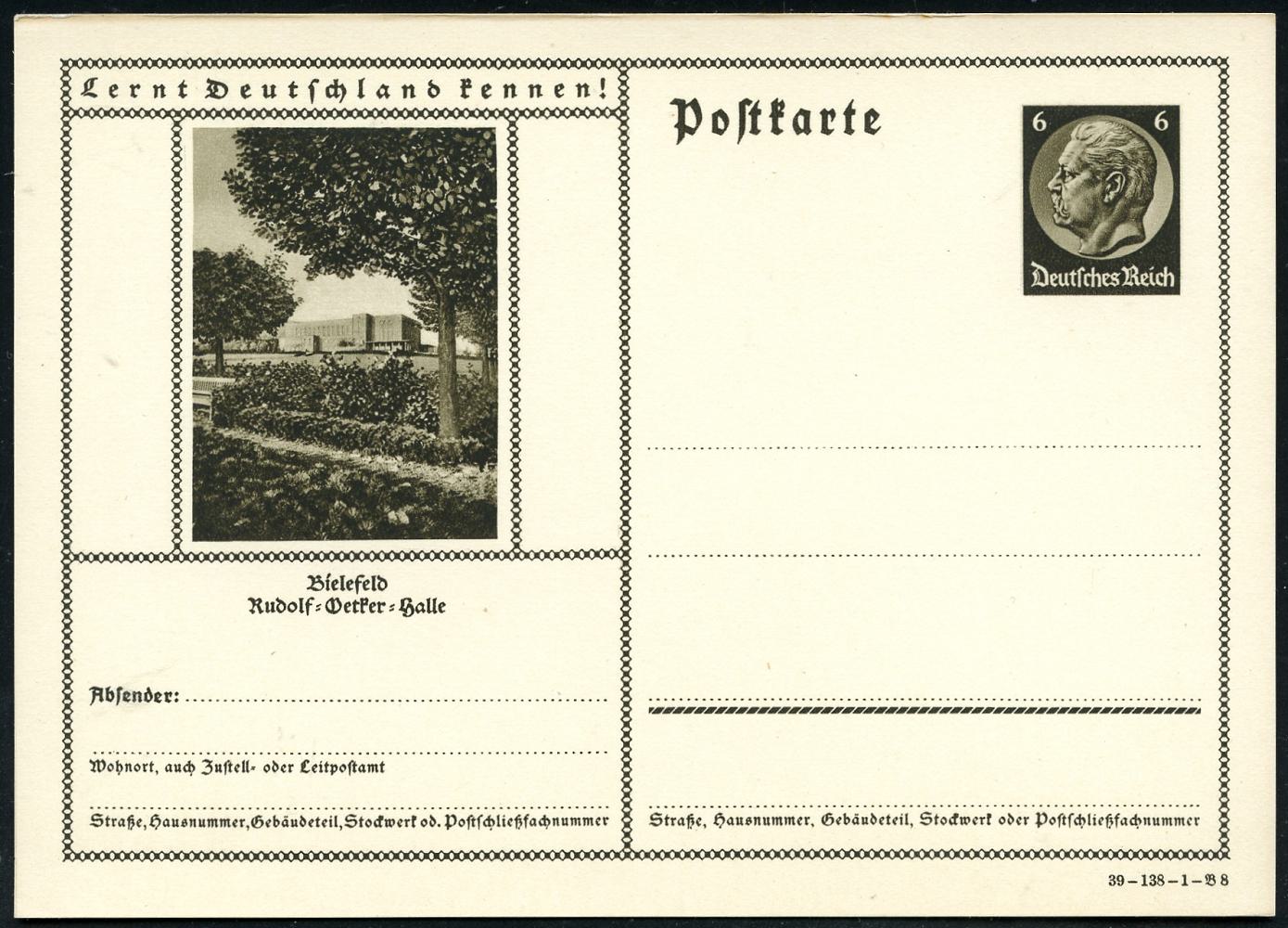 8405 | 10 € | 4800 Bielefeld allgem. Belege, Tagestempel etc. : BIELEFELD 1939 6 Pf. BiP Hindenbg., braun: Rudolf-Oetker-Halle , ungebr. (Mi.P 236-39-138-1.B 8) | ![]() | |