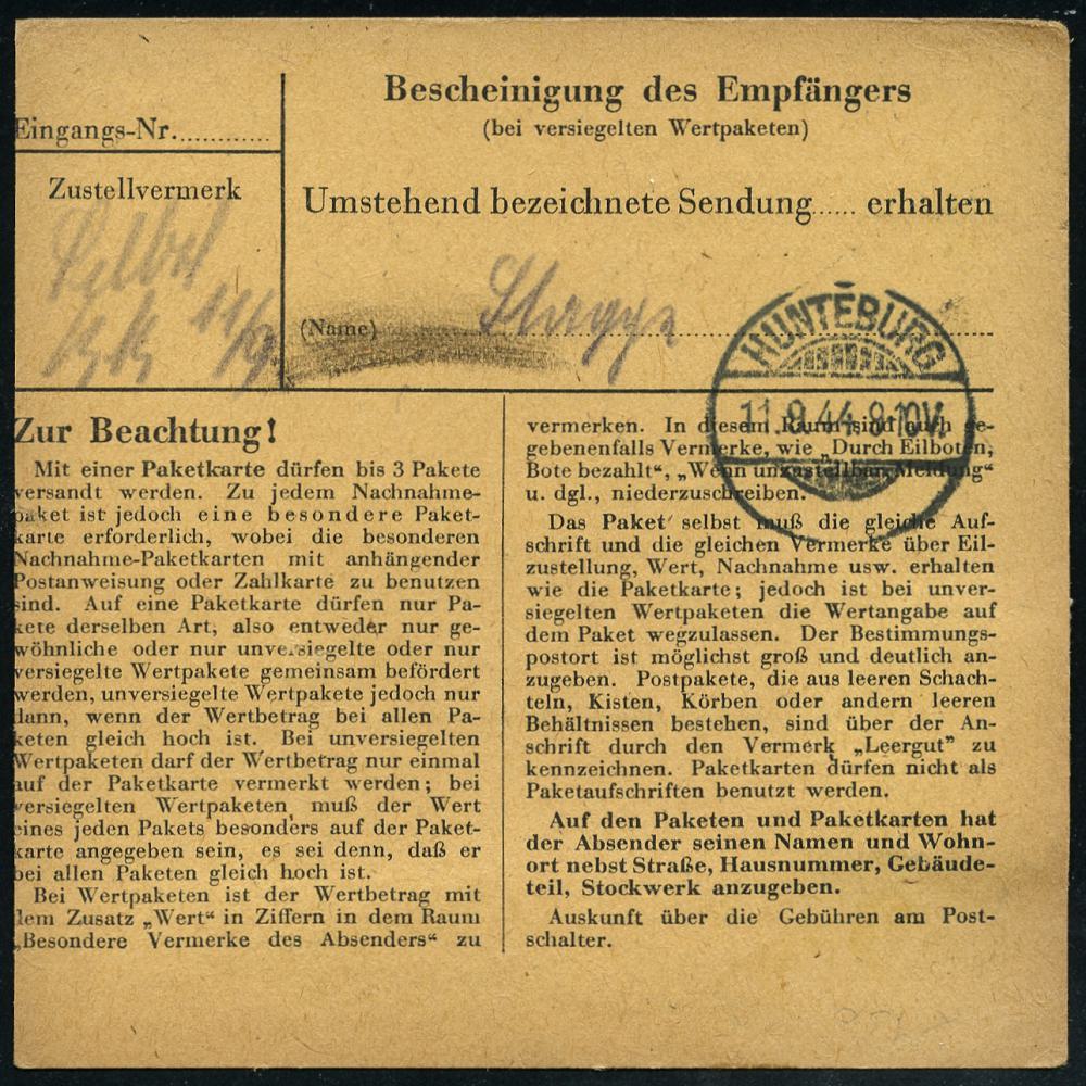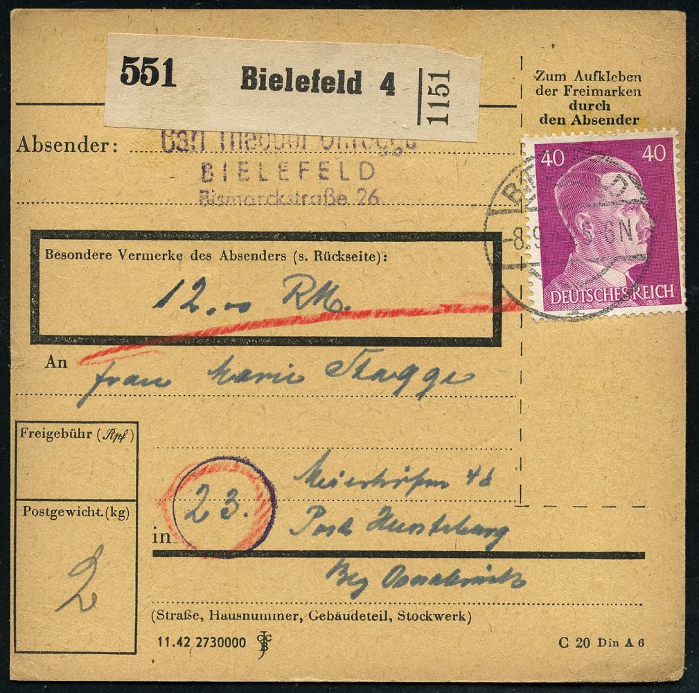 8407 | 18 € | 4800 Bielefeld allgem. Belege, Tagestempel etc. : BIELEFELD/ 4 1944 (11.8.) 1K-Brücke auf EF 40 Pf. Hitler + schw. Paketzettel 4 , klar gest. Inl.-Paket-Kt. n. Hunteburg, rs. AS. (Mi.795 EF) | ![]() ![]() | |
