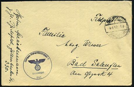 8406 | 14 € | 4800 Bielefeld allgem. Belege, Tagestempel etc. : BIELEFELD-/ SCHILDESCHE 1942 (4.4.) 1K-Brücke + viol. 1K-HdN: Luftgau-Flakartillerieschule 6/Stab + vs. hs. Abs., Feldpost-Bf. n. Bad Salzuflen | ![]() | |