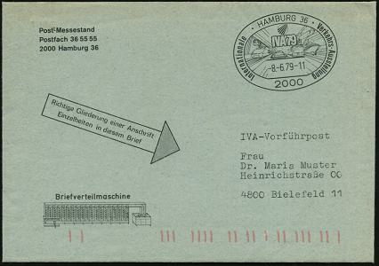 8414 | 14 € | 4800 Bielefeld allgem. Belege, Tagestempel etc. : 4800 Bielefeld 11 1979 (8.6.) postamtl. Vorführ-Umschlag IVA Hamburg ohne Werteindruck: Briefverteilmaschine + Buchdruck-SSt.: 2000 HAMBURG 36/I V A.. (Format C 6) "IVA-Vorführpost" mit rosa Linear-Code für PLZ 4800 Bielefeld 11 | ![]() | |