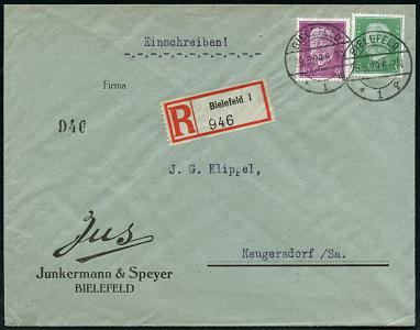 8402 | 18 € | 4800 Bielefeld allgem. Belege, Tagestempel etc. : BIELEFELD/ * 1 q 1929 (29.5.) 1K-Brücke 2x auf Hindenbg. 5 Pf. u. 40 Pf. = satzreine Frankatur + RZ: Bielefeld 1 , Firmen-Fern-R-Bf.: Junkermann & Speyer.. (Dü.411, 418) | ![]() | |