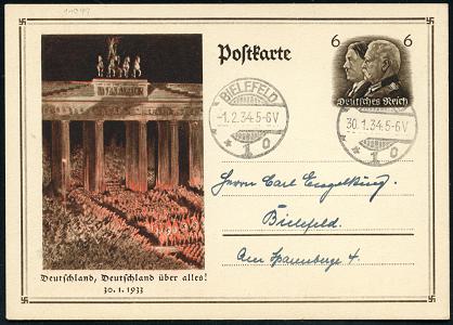 8403 | 16 € | 4800 Bielefeld allgem. Belege, Tagestempel etc. : BIELEFELD/ * 1 o 1934 (1.2.) alter 1K-Gitterbrücke (Brücke links gebrochen) auf Sonder-P 6 Pf. Hitler/Hindenbg.: Deutschland, Deutschland über alles!, 30.1.1933 = Jahrestag Machtergreifung! (SA am Brandenbg. Tor), Orts-Kt. mit Text (Mi.P 250) | ![]() | |