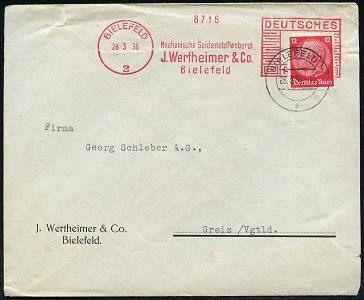 8404 | 25 € | 4800 Bielefeld allgem. Belege, Tagestempel etc. : BIELEFELD 2/ e 1936 (28.3.) 2K-Steg auf 12 Pf. Hindenbg., nachfrankiert auf AFS: BIELEFELD/2/Mechanische Seidenstoffweberei/ J. Wertheimer & Co.. (Dü.E-2CEh), Firmen-Bf. (= jüdische Firma!) zum Doppel-Fern-Bf. aufgewertet n. Greiz, seltene Verwendng! (Mi.519 EF) | ![]() | |