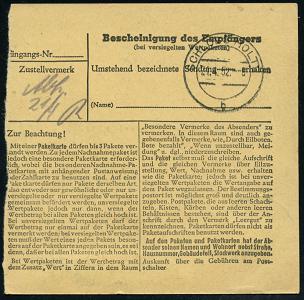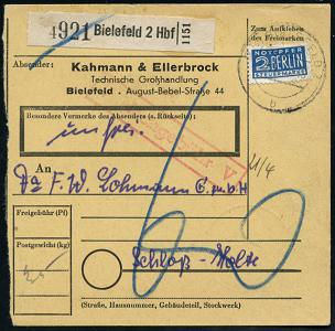8410 | 18 € | 4800 Bielefeld allgem. Belege, Tagestempel etc. : (21a) BIELEFELD 2/ b 1952 (19.4.) 2K-Steg auf EF 2 Pf. NoB + schw. Paletzettel: Bielefeld 2 Hbf + roter Ra.: V Nachgebühr V + hs. Gebühr "60" (Pf.) unfreie Paket-Kt. Fa. Kahrmann & Ellerbrock, Techn. Großhandlung, Bielefeld.. n. Schloß-Holte, rs. AS. | ![]() ![]() | |