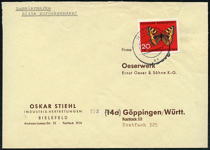 8412 | 10 € | 4800 Bielefeld allgem. Belege, Tagestempel etc. : BIELEFELD 2/ ax 1952 (13.11.) aptierter 2K-Steg = alte PLGZ entfernt auf EF Wofa 20 + 10 Pf. Schmetterlin , Firmen-Fern-Bf.: OSKAR STIEHL.. (Mi.378 EF + 6.- EUR) | ![]() | |