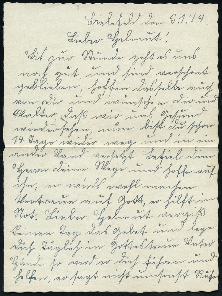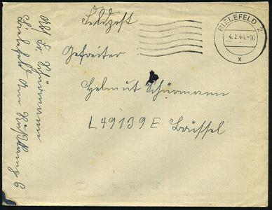 8428 | 14 € | 4800 Bielefeld Maschinen- u. Serienstempel : BIELEFELD 2/ x 1944 (4.2.) MaWellenSt. auf Feldpost-Bf. (kl. Echkriß) + Inhalt an Fp.-Nr. L 49139 = Luftwaffen-Jäger Regt. 38, Brüssel | ![]() ![]() | |
