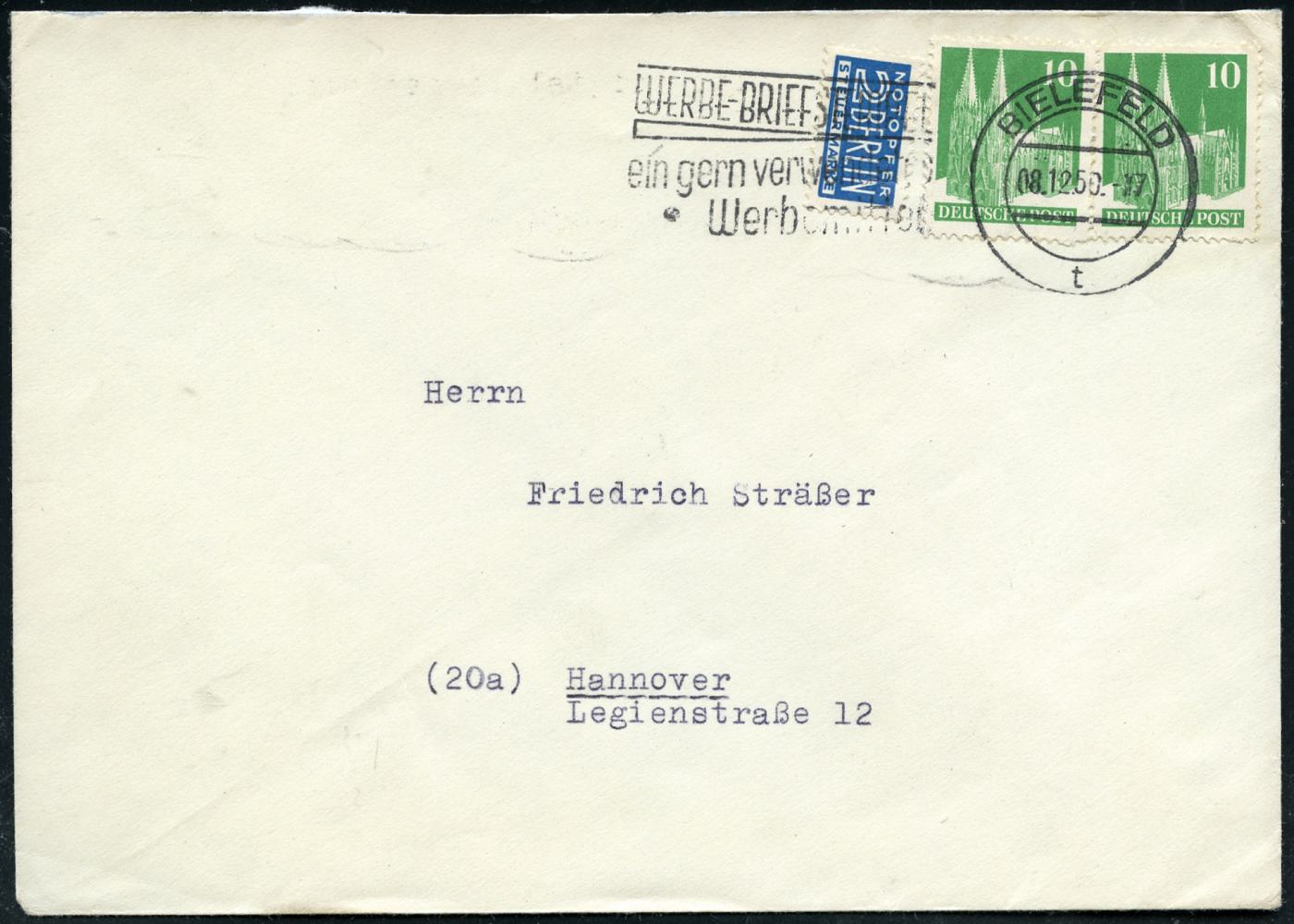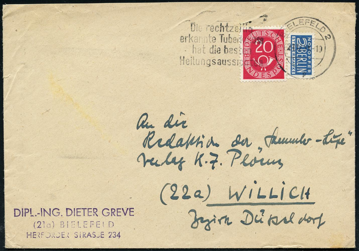 8433 | 12 € | 4800 Bielefeld Maschinen- u. Serienstempel : BIELEFELD 2/ p/ Die rechtzeitig/ erkannte Tuberkulose/ hat die besten/ Heilungschancen 1951 (21.12.) Serien-MWSt auf EF 20 Pf. Posthorn + 2 Pf. NoB, Fern-Bf. (Bo.S 444 A, nur in 5 Orten verwendet) | ![]() | |