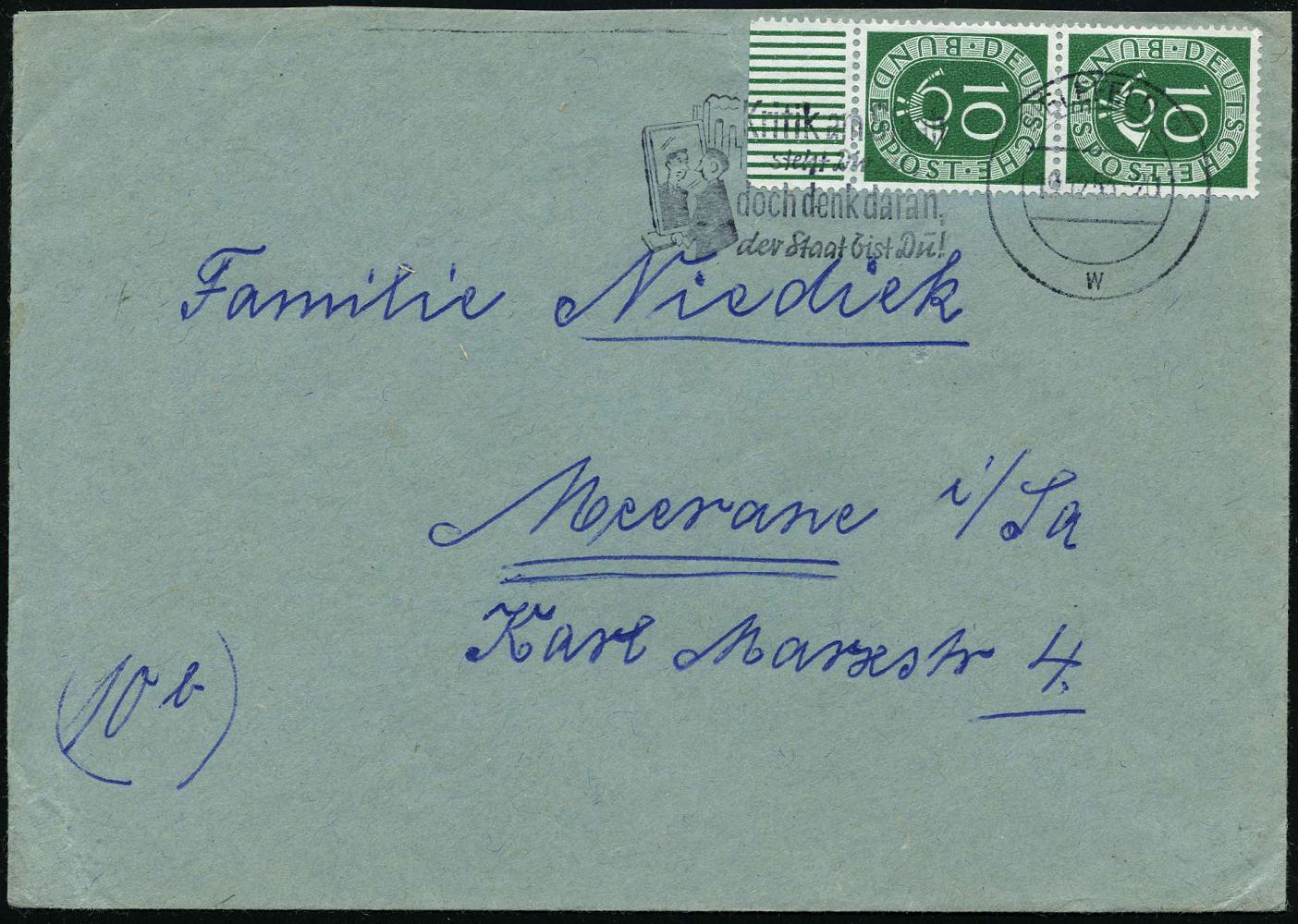 8434 | 25 € | 4800 Bielefeld Maschinen- u. Serienstempel : BIELEFELD 2/ w/ Kritik am Staate/ steht Dir zu/ doch denk daran,/ d.Staat bist Du! 1953 (19.12.) Serien-MWSt (Bürger vor Spiegel) notopferbefreit und unbeanstandet auf Fern-Bf. in die DDR ! (Postkrieg), seltene Verwendung! (Bo.S 653 A) | ![]() | |