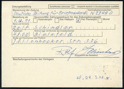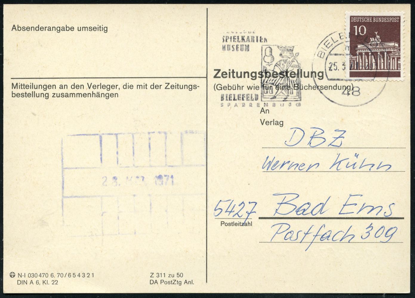 8439 | 25 € | 4800 Bielefeld Maschinen- u. Serienstempel : 48 BIELEFELD 2/ me/ DEUTSCHES/ SPIELKARTEN/ MUSEUM.. 1971 (25.3.) MWSt (Eichel-König) auf 10 Pf. Brandenbg. Tor auf Inl.-Zeitungsbestellung = niedrigste BRD-Portostufe!, Fern-Kt. n. Bad Ems, seltene Portostufe! (Mi.506 EF) | ![]() ![]() | |