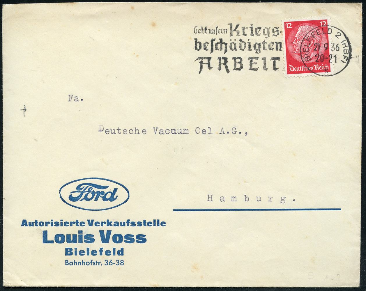 8425 | 18 € | 4800 Bielefeld Maschinen- u. Serienstempel : BIELEFELD 2 (BHF)/ s/ Gebt unseren Kriegs-/ beschädigten/ ARBEIT 1936 (21.9.) Serien-MWSt auf Firmen-Bf.: Ford, Autorisierte Verkaufsstelle, Louis Voss.. (Firmen-Logo) n. Hamburg, vergl. Kat.-Nr.8451 (Bo.S 152 A, nur in 6 Orten 1934-37 verwendet) | ![]() | |