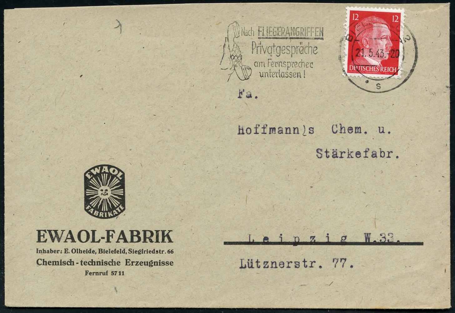8427 | 25 € | 4800 Bielefeld Maschinen- u. Serienstempel : BIELEFELD 2/ s/ Nach FLIEGERANGRIFFEN/ Privatgespräche/ am Fernsprecher/ unterlassen! 1943 (21.3.) seltener Serien-MWSt (Hand mit Telefonhörer) Firmen-Bf.: EWAOL-FABRIK.. Chem.-technische Erzeugniss n. Leipzig (Bo.S 400 A, nur Apr. 1943 bis Apr. 1945 verwendet) | ![]() | |