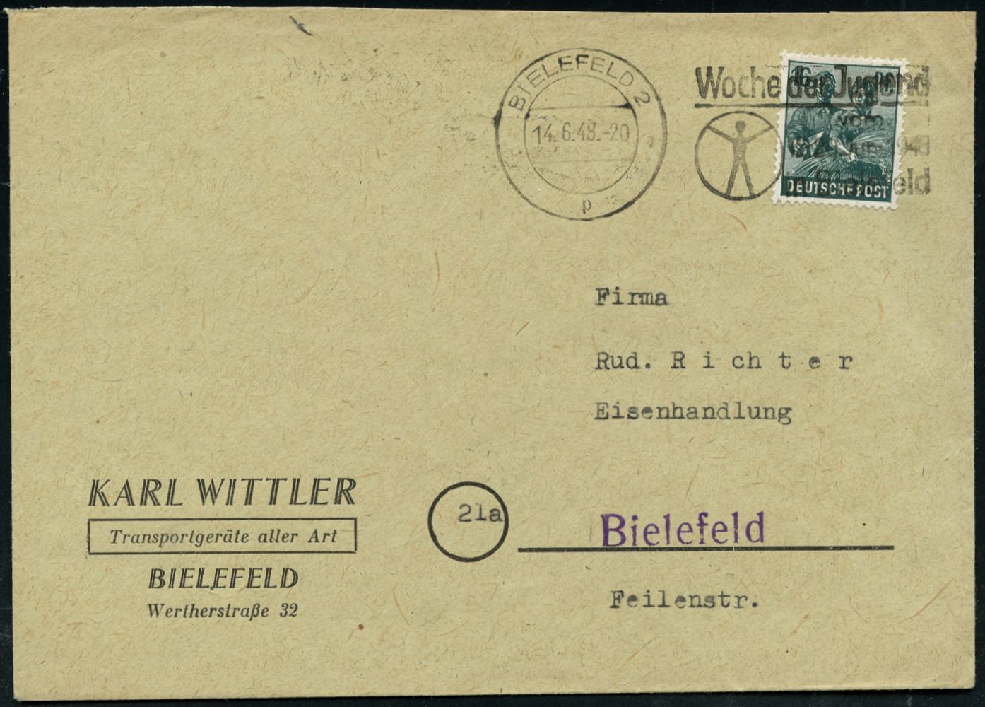 8429 | 16 € | 4800 Bielefeld Maschinen- u. Serienstempel : BIELEFELD 2/ i/ Woche der Jugend.. 1948 (14.6.) MWSt (Figur) Text rechts , Firmen-Bf.: KARL: WITTLER, Transportgeräte.., Orts-Bf. (Bo.9 B) | ![]() | |