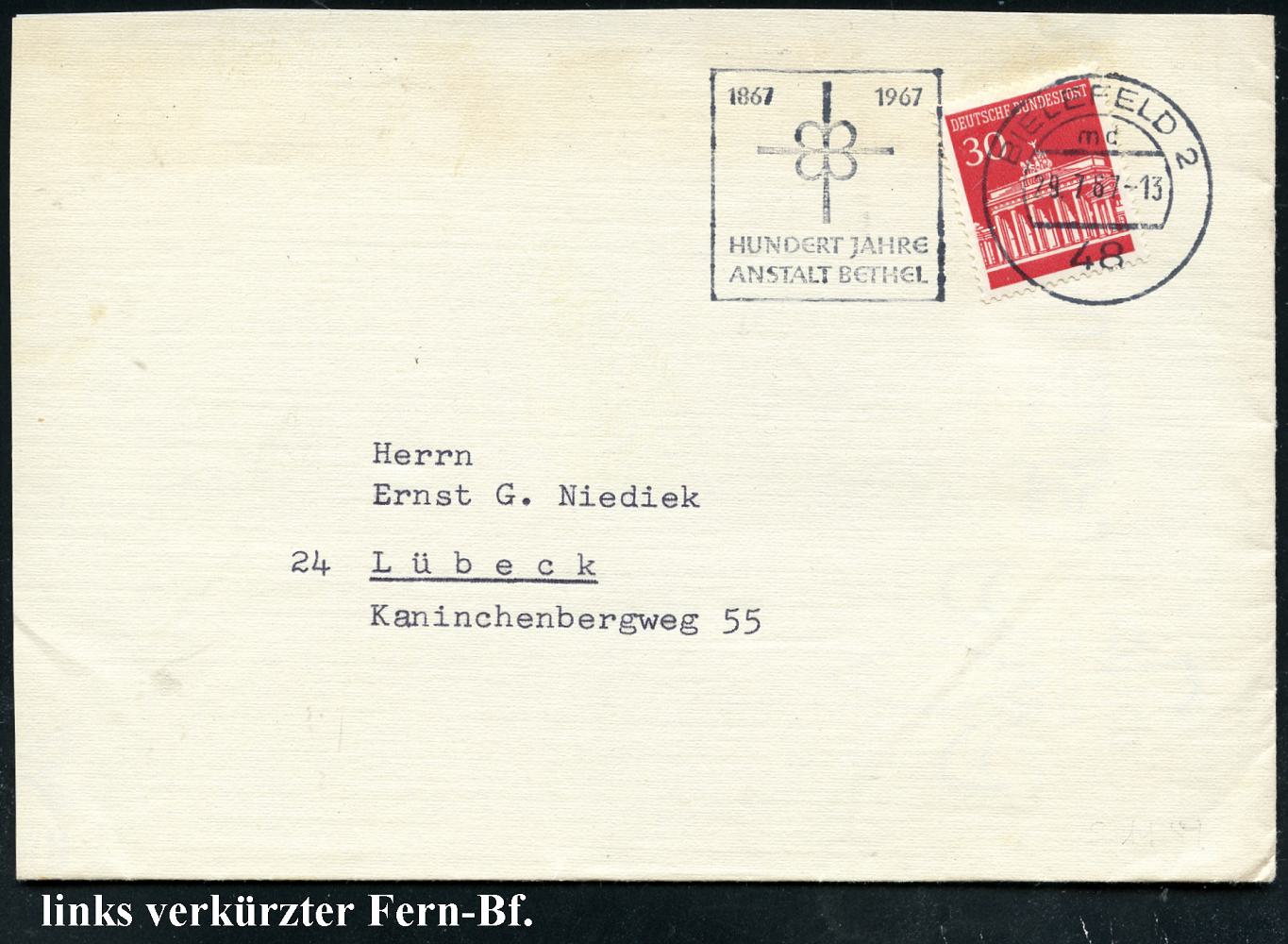 8438 | 10 € | 4800 Bielefeld Maschinen- u. Serienstempel : 48 BIELEFELD 2/ md/ 1867 1967/ HUNDERT JAHRE/ ANSTALT BETHEL 1967 (29.7.) Serien-MWSt (Kreuz-Symbol) links verkürtzer Fern-Bf. (Bo.S 1181 A) | ![]() | |