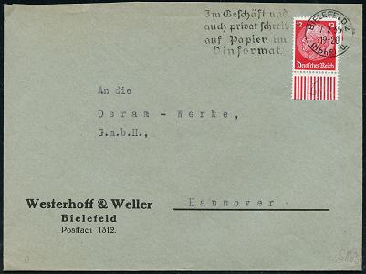 8423 | 18 € | 4800 Bielefeld Maschinen- u. Serienstempel : BIELEFELD/ *b/ 2 HBHF./ Jm Geschäft u./ auch privat schreib/ auf Papier im/ Dinformat 1935 (7.2.) Serien-MWSt klar auf Firmenbf.: Westerhoff & Weller.., im III. Reich von 1934-38 verwendet (Bo.S 163 A) | ![]() | |