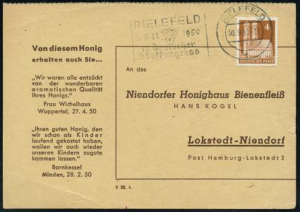 8431 | 15 € | 4800 Bielefeld Maschinen- u. Serienstempel : BIELEFELD/ t/ 15.Deutscher/ Skatkongress 1950 (30.9.) MWSt = Hand mit 4 Assen , klar auf Bauten-Frankatur, Firmen-Kt. (Bo.12 A) | ![]() | |