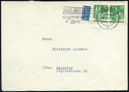 8432 | 14 € | 4800 Bielefeld Maschinen- u. Serienstempel : BIELEFELD/ t/ WERBE-BRIEFSTEMPEL/ ein gern verwendetes/ Werbemittel 1950 (8.1.) Serien-MWSt auf Bauten-Frankatur + 2 Pf. NoB , klar gest. Fernbf. (Bo.S 545, Erstjahr) | ![]() | |